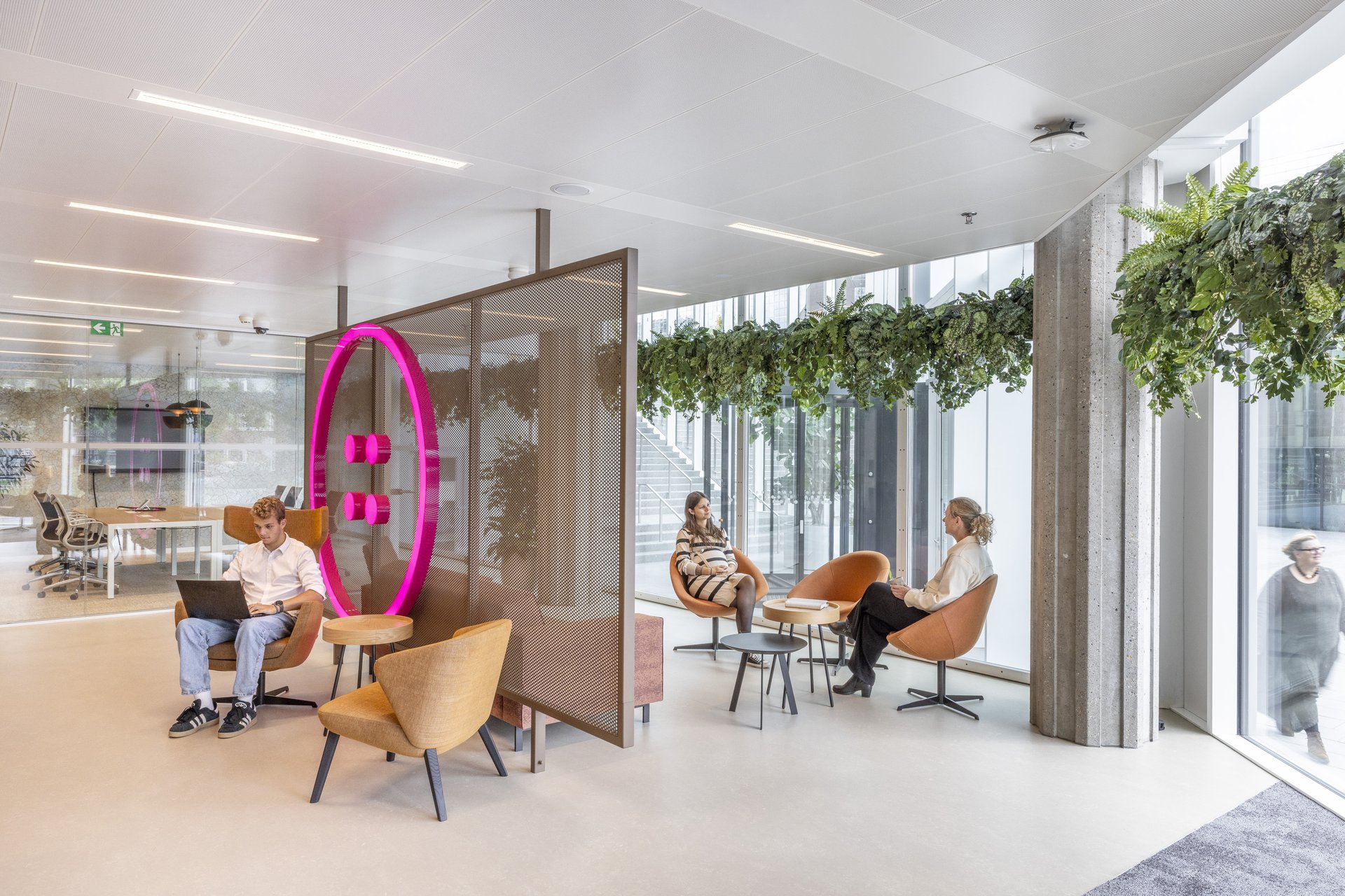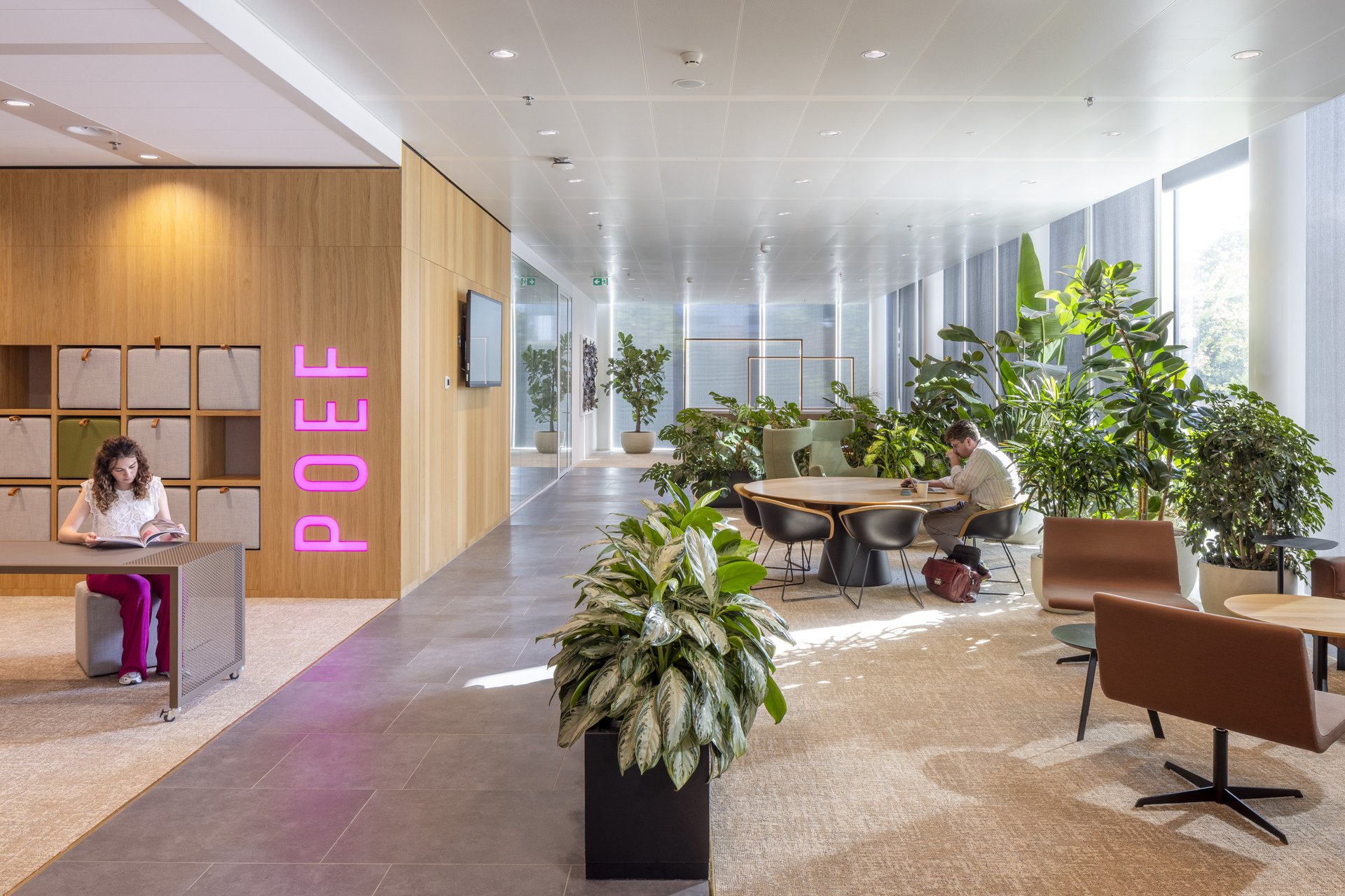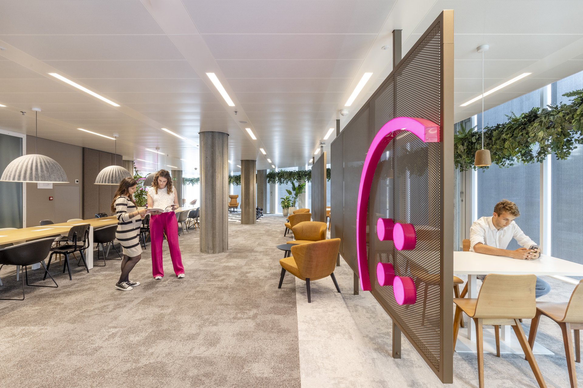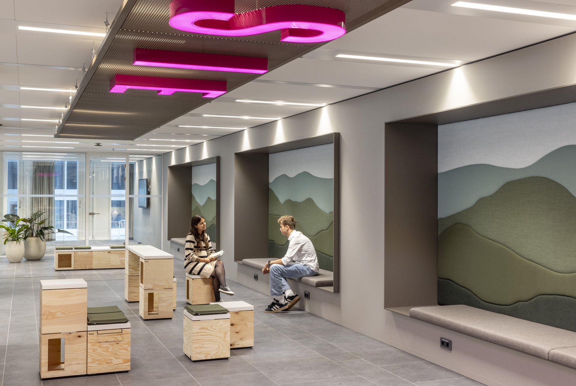 Pink stands for dynamism. It lights the way, invites movement, and sparks collaboration. From the signature bar with its metallic weave to the table adorned with repurposed buttons, the design plays with curves and lines, seamlessly connected through light and material. Vitality pulses through pouf, pulse, and passion. Three words glowing in pink neon throughout the space. They symbolize motion, energy, and expression. Mobile seating encourages dynamic use of the space, while form and color bring rhythm to the whole. Biophilic design adds balance and calm: a lush green wall makes a lively statement, and acoustic panels unfold lika a mountain landscape, giving the space natural depth.