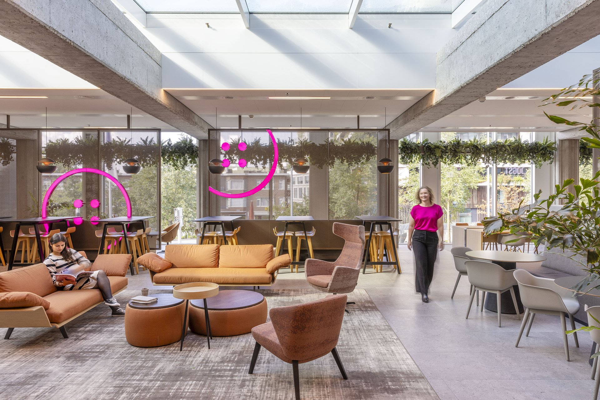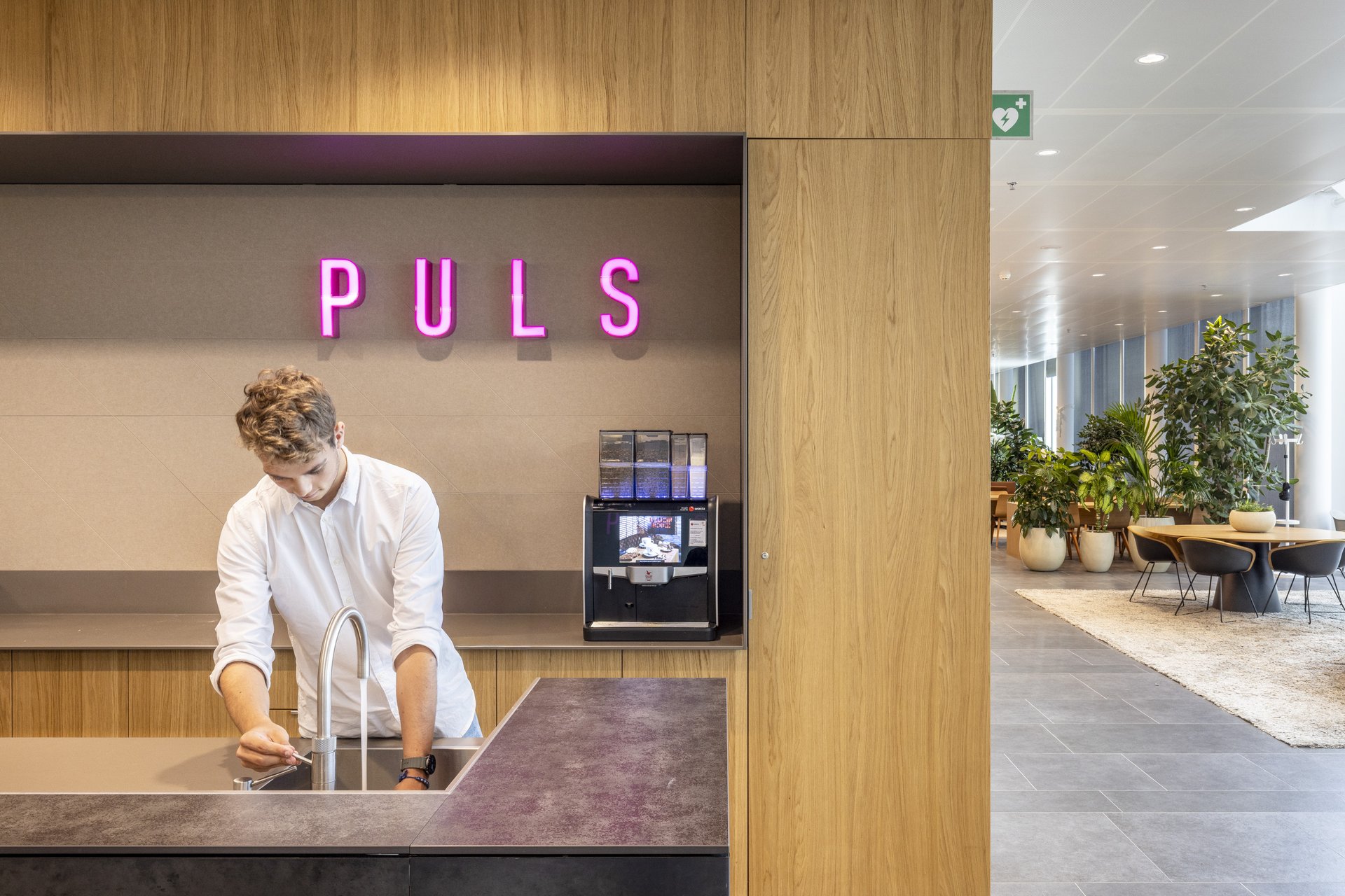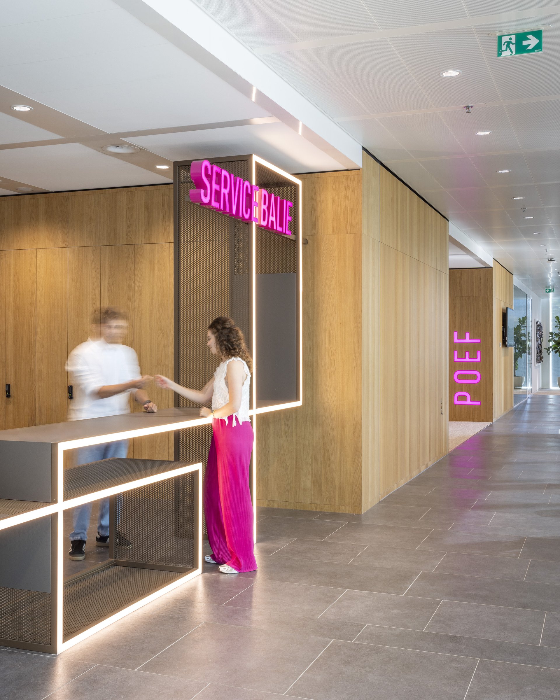 Pink stands for dynamism. It lights the way, invites movement, and sparks collaboration. From the signature bar with its metallic weave to the table adorned with repurposed buttons, the design plays with curves and lines, seamlessly connected through light and material. Vitality pulses through pouf, pulse, and passion. Three words glowing in pink neon throughout the space. They symbolize motion, energy, and expression. Mobile seating encourages dynamic use of the space, while form and color bring rhythm to the whole. Biophilic design adds balance and calm: a lush green wall makes a lively statement, and acoustic panels unfold lika a mountain landscape, giving the space natural depth.