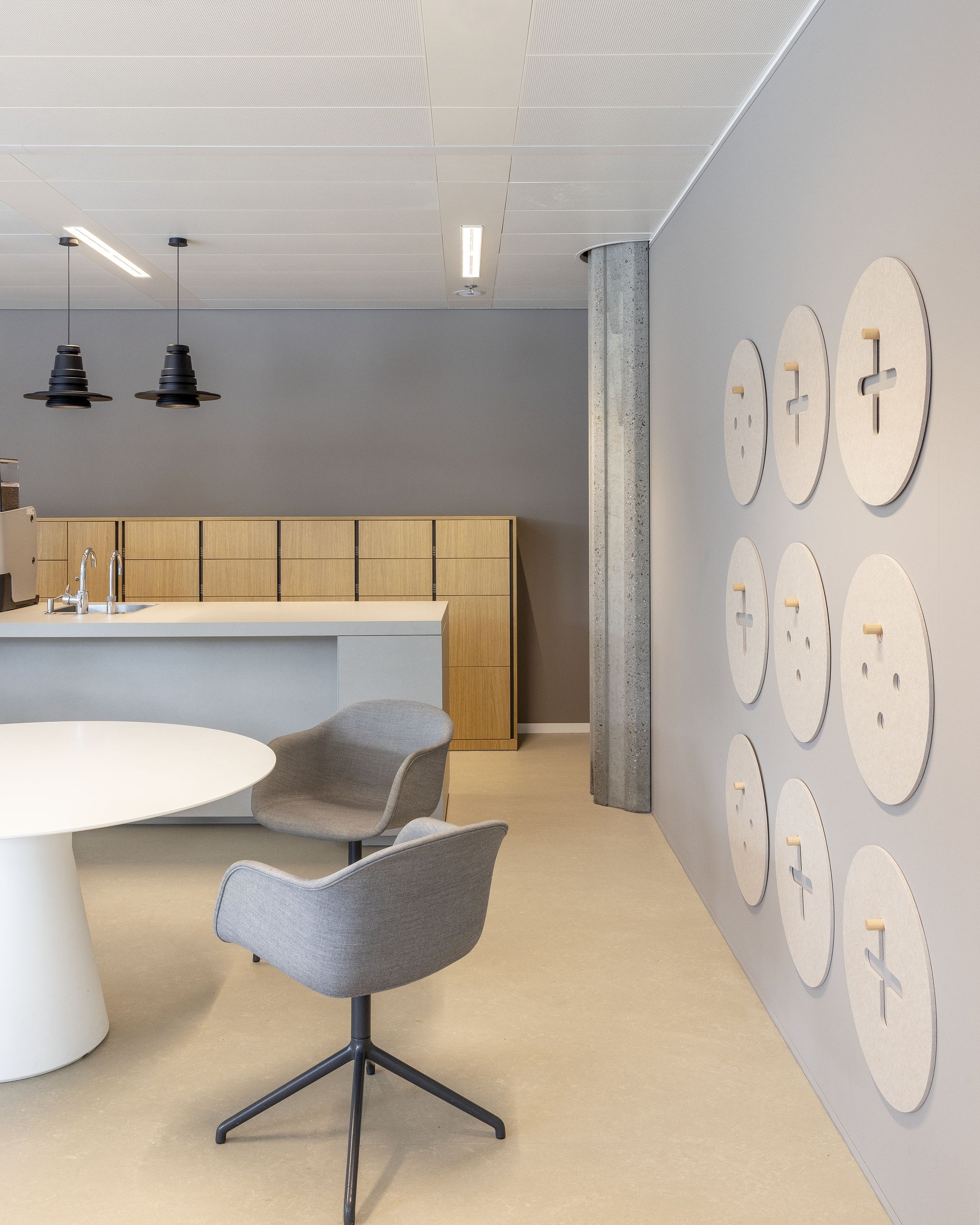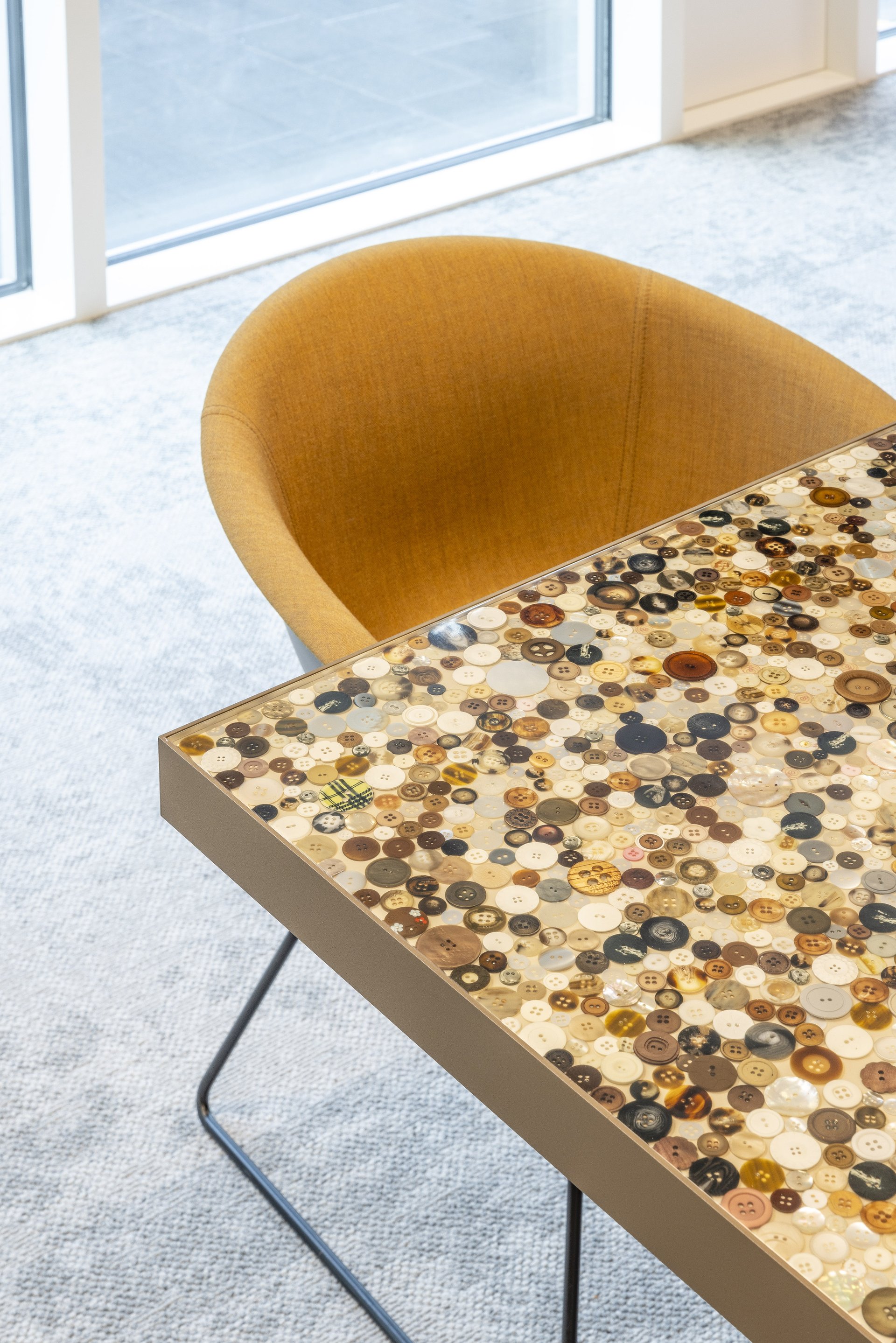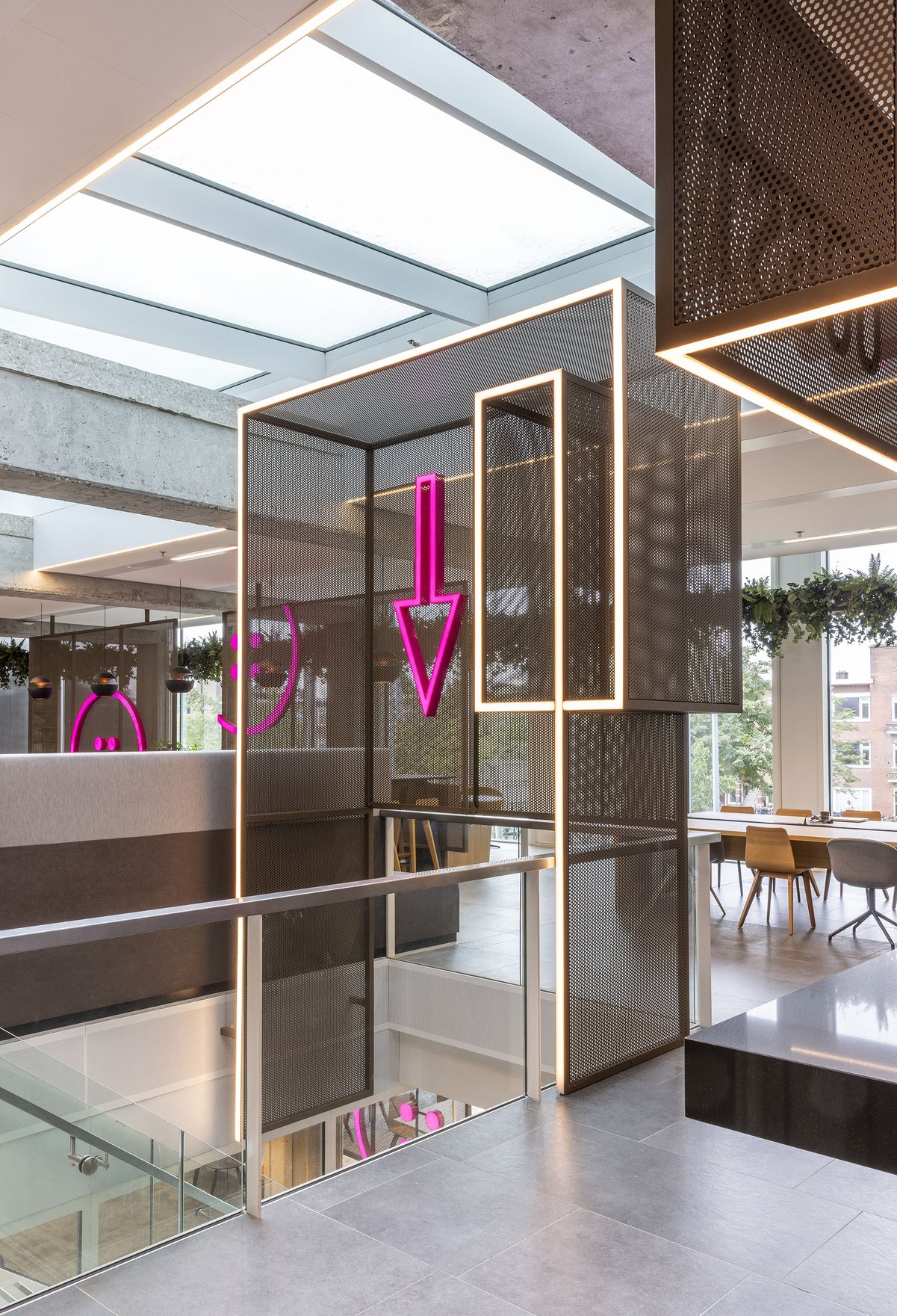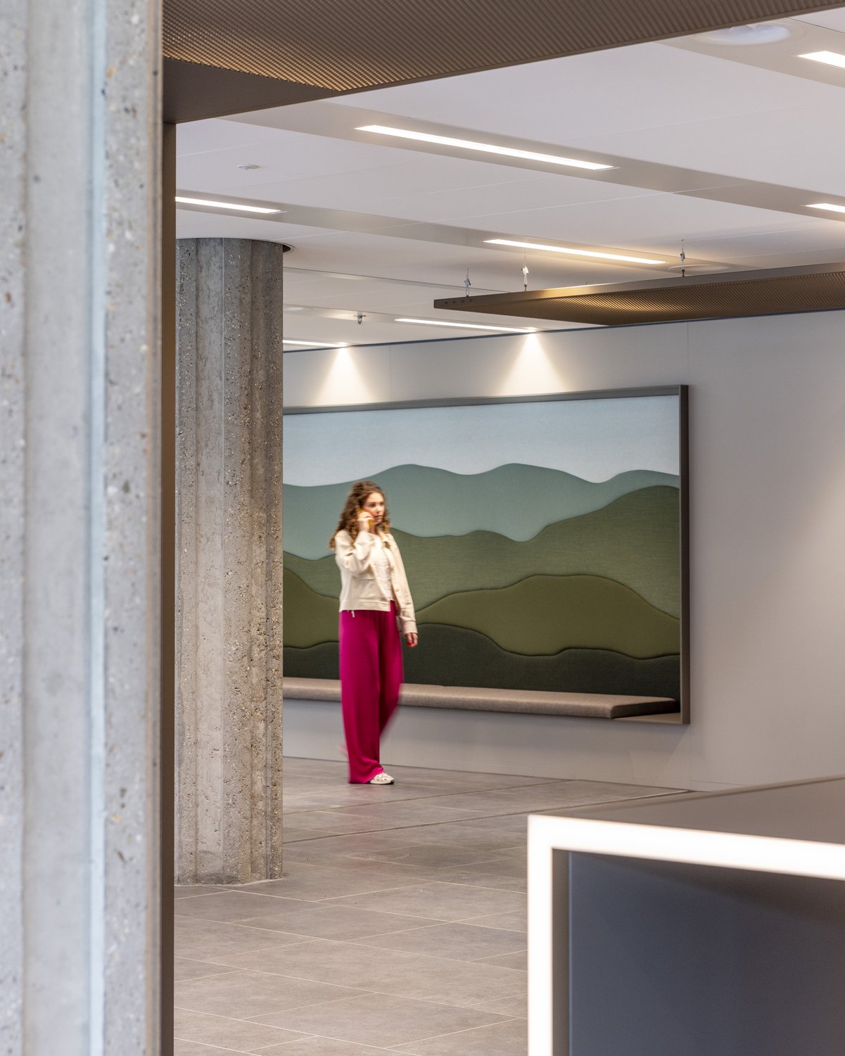Pink stands for dynamism. It lights the way, invites movement, and sparks collaboration. From the signature bar with its metallic weave to the table adorned with repurposed buttons, the design plays with curves and lines, seamlessly connected through light and material. Vitality pulses through pouf, pulse, and passion. Three words glowing in pink neon throughout the space. They symbolize motion, energy, and expression. Mobile seating encourages dynamic use of the space, while form and color bring rhythm to the whole. Biophilic design adds balance and calm: a lush green wall makes a lively statement, and acoustic panels unfold lika a mountain landscape, giving the space natural depth.