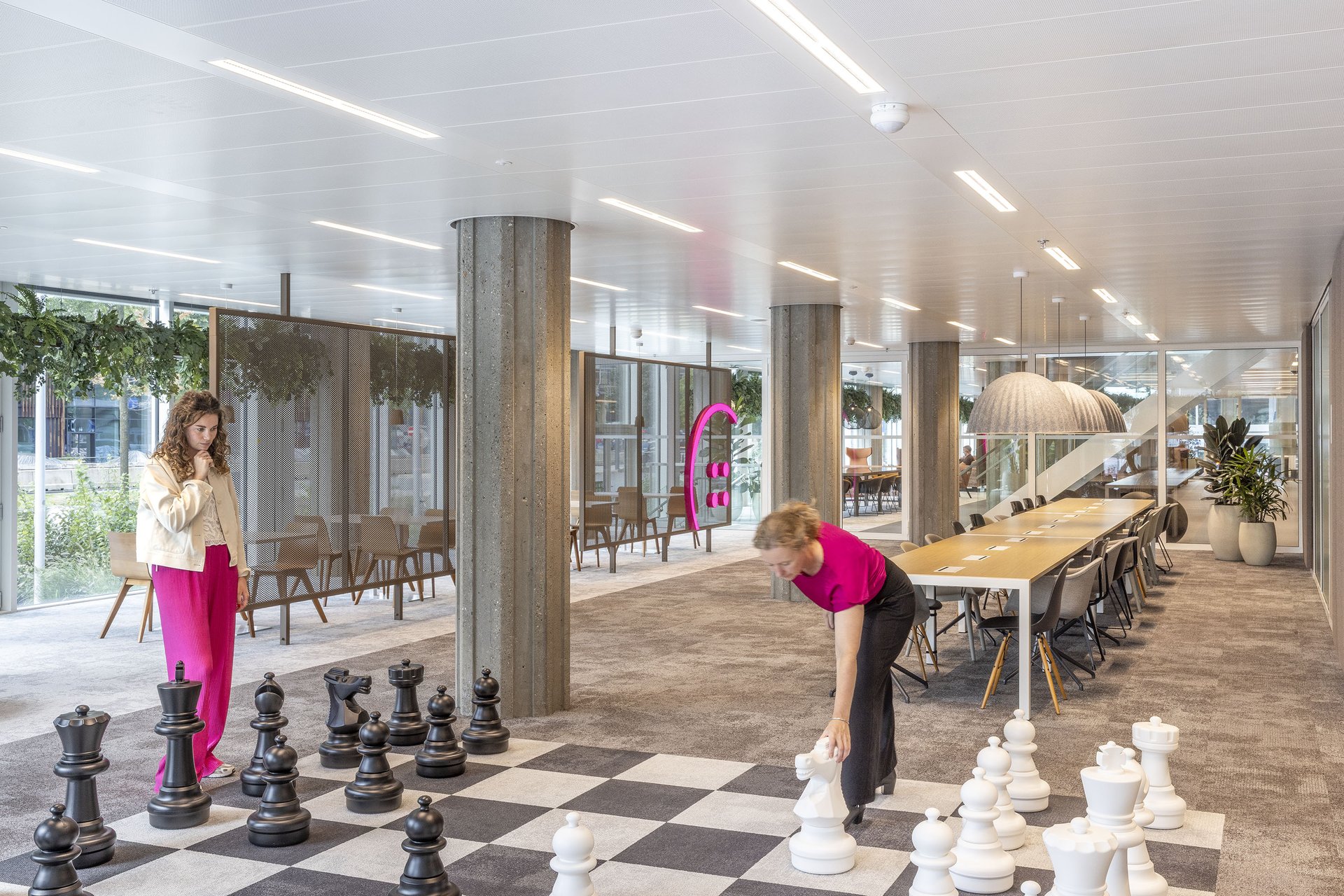 At De Knoop, functions intertwine as if they were always meant to be together. The service desk is no longer tucked away, but proudly visible and welcoming. An extension of the public realm. The floor once hidden beneath the restaurant is now a place you can’t help but notice. It invites spontaneous encounters: a setting where you can play chess or have an informal chat at the ping-pong table. Here, play becomes a tool for effortless connection.