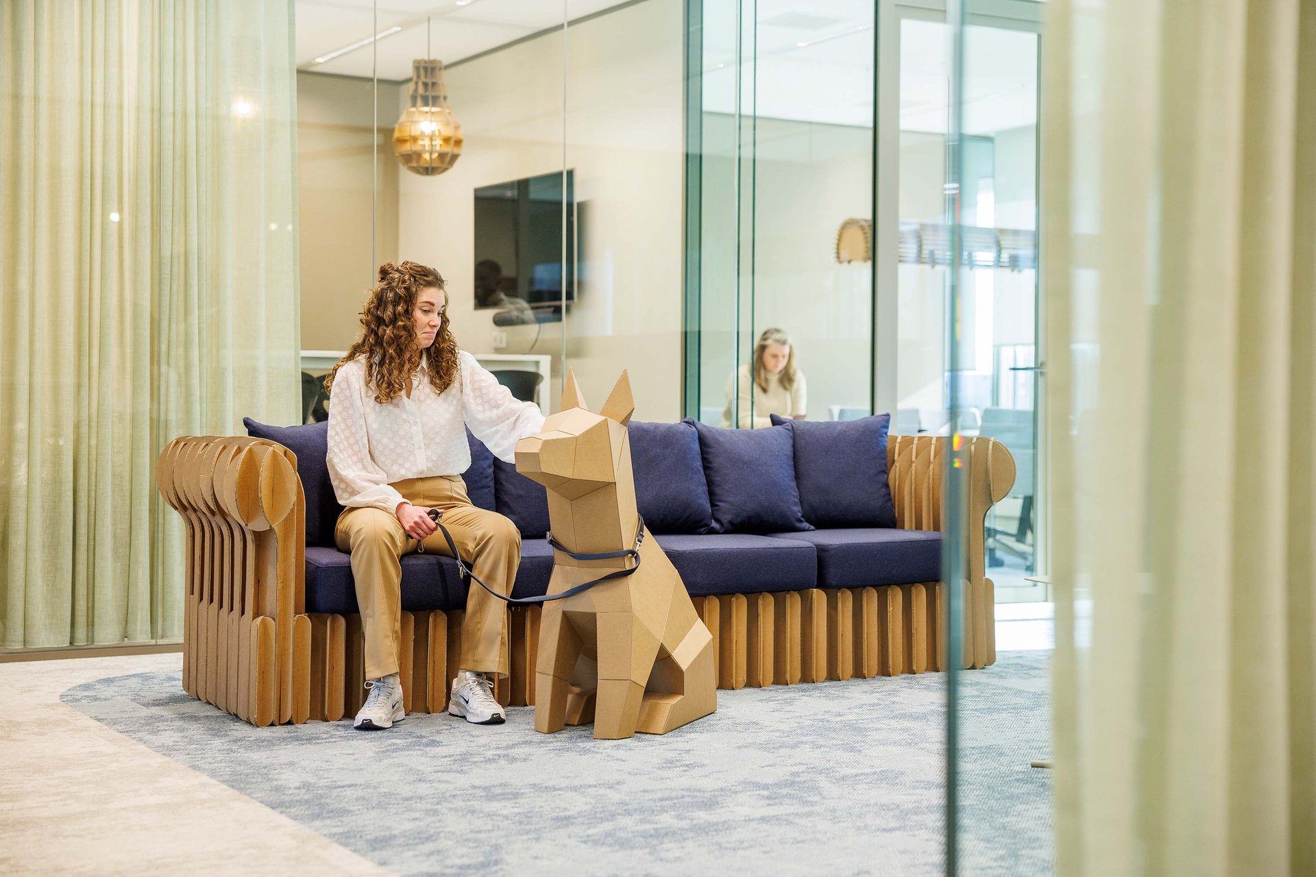Fokkema & Partners had the freedom to go all-in with cardboard, and they did. From a cardboard Chesterfield sofa to lighting fixtures, from a lush green wall made of packaging materials to a sculptural cardboard dog. Everywhere you look, the material takes center stage. Wall graphics reference the journey of their boxes in transit, while playful design elements nod to the Westrock logo. Every detail celebrates the product Smurfit Westrock is proud to stand behind.