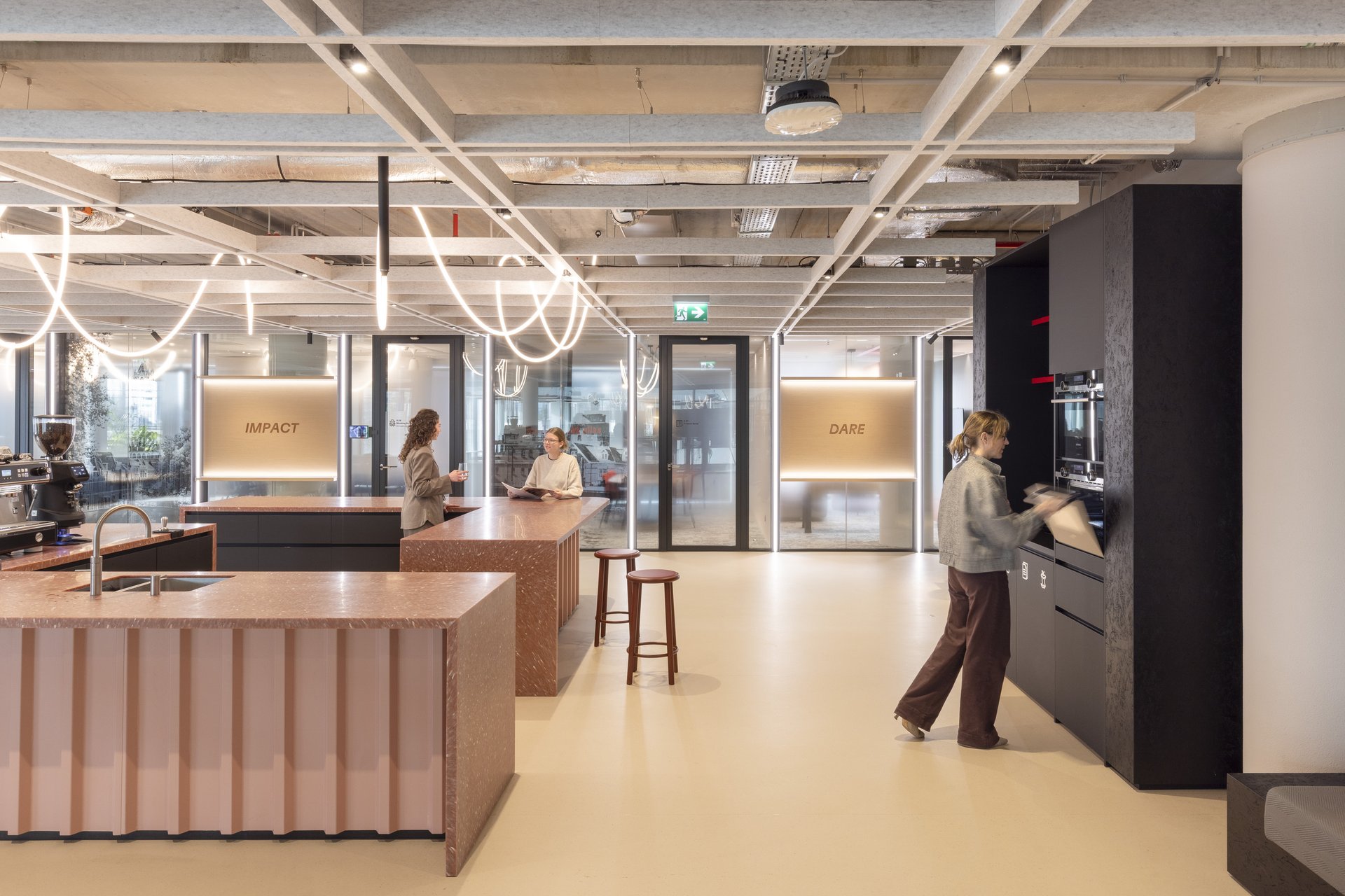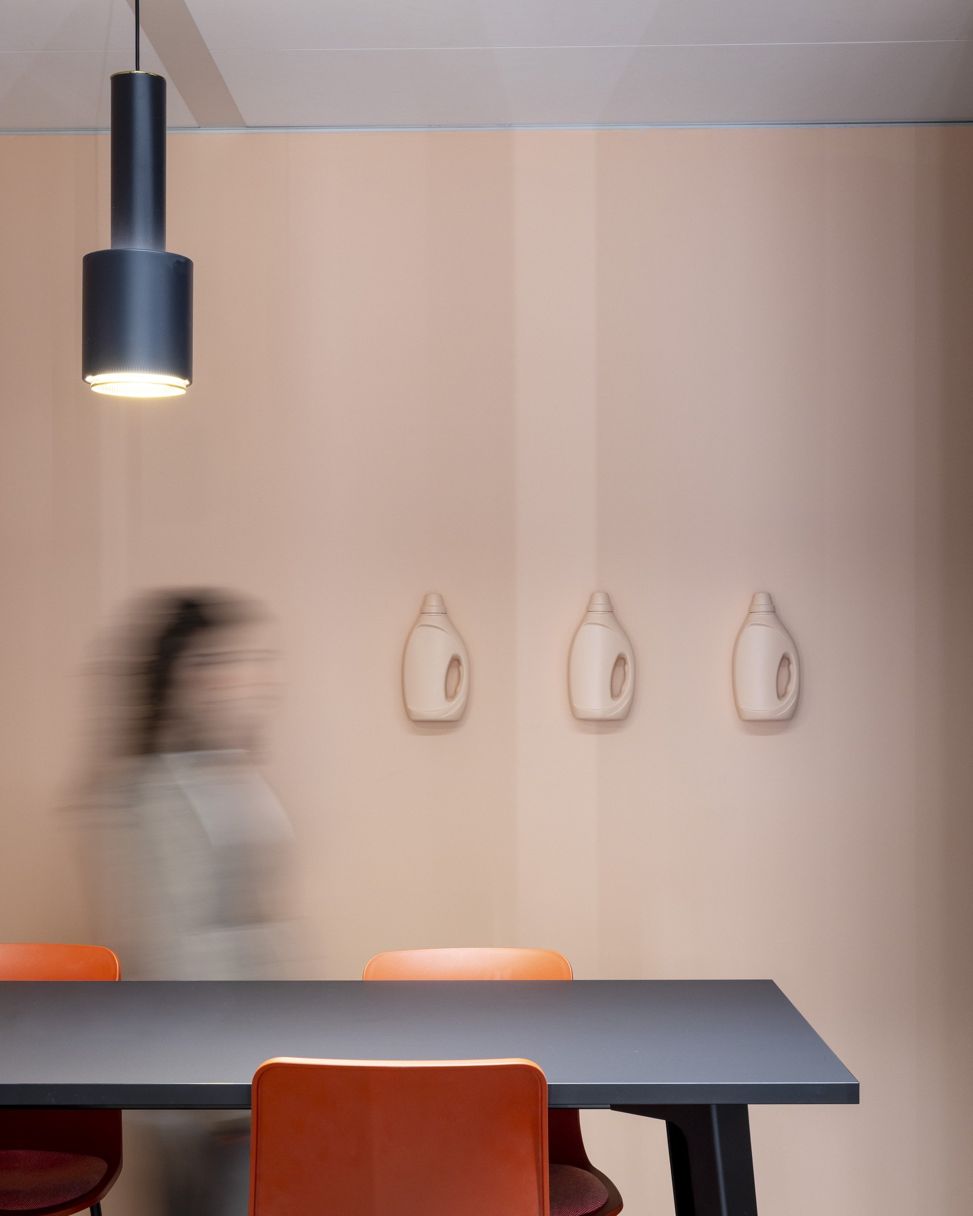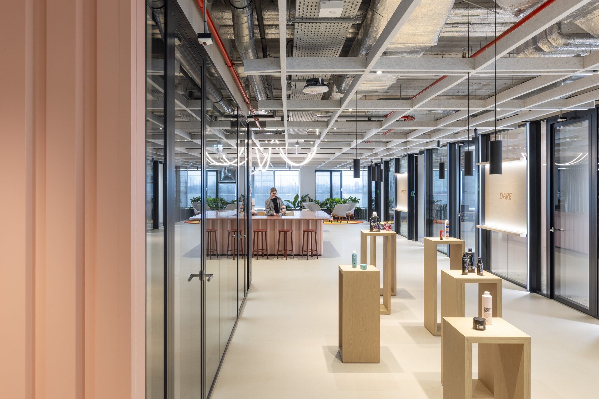 While the Amsterdam design focused on the diversity of people and brands, the Utrecht office places the Benelux market centre stage. Products and brands are experienced through oversized visuals, carefully positioned objects and dynamic photography that brings movement and energy into the space. Sharing the floor with the Academy of Hair allowed for a more expressive visual language and bold contrasts, while subtle industrial details refer to Utrecht’s history of steel and rail. The result is a distinctive yet cohesive working environment that invites, surprises and inspires confidence. Exactly what the Henkel brands stand for.