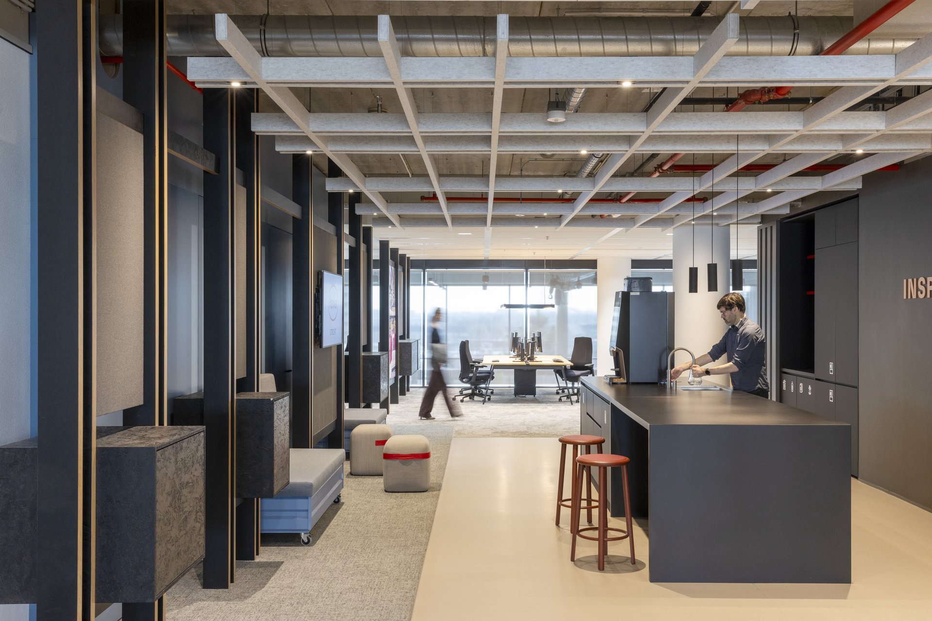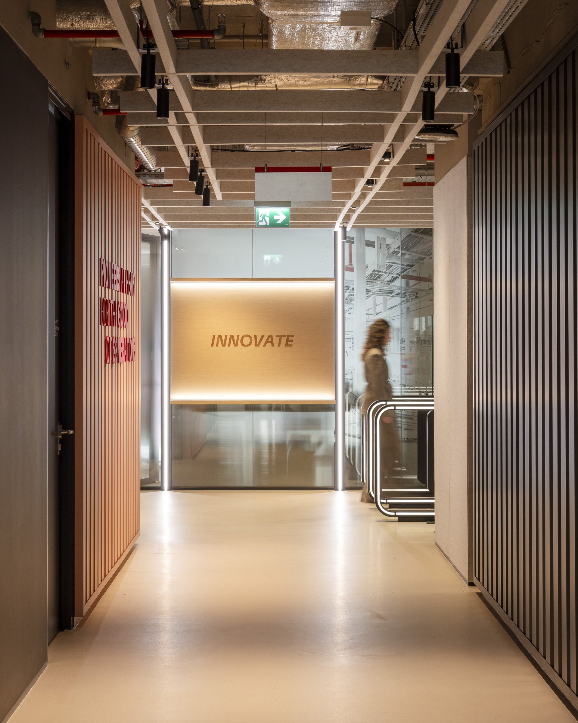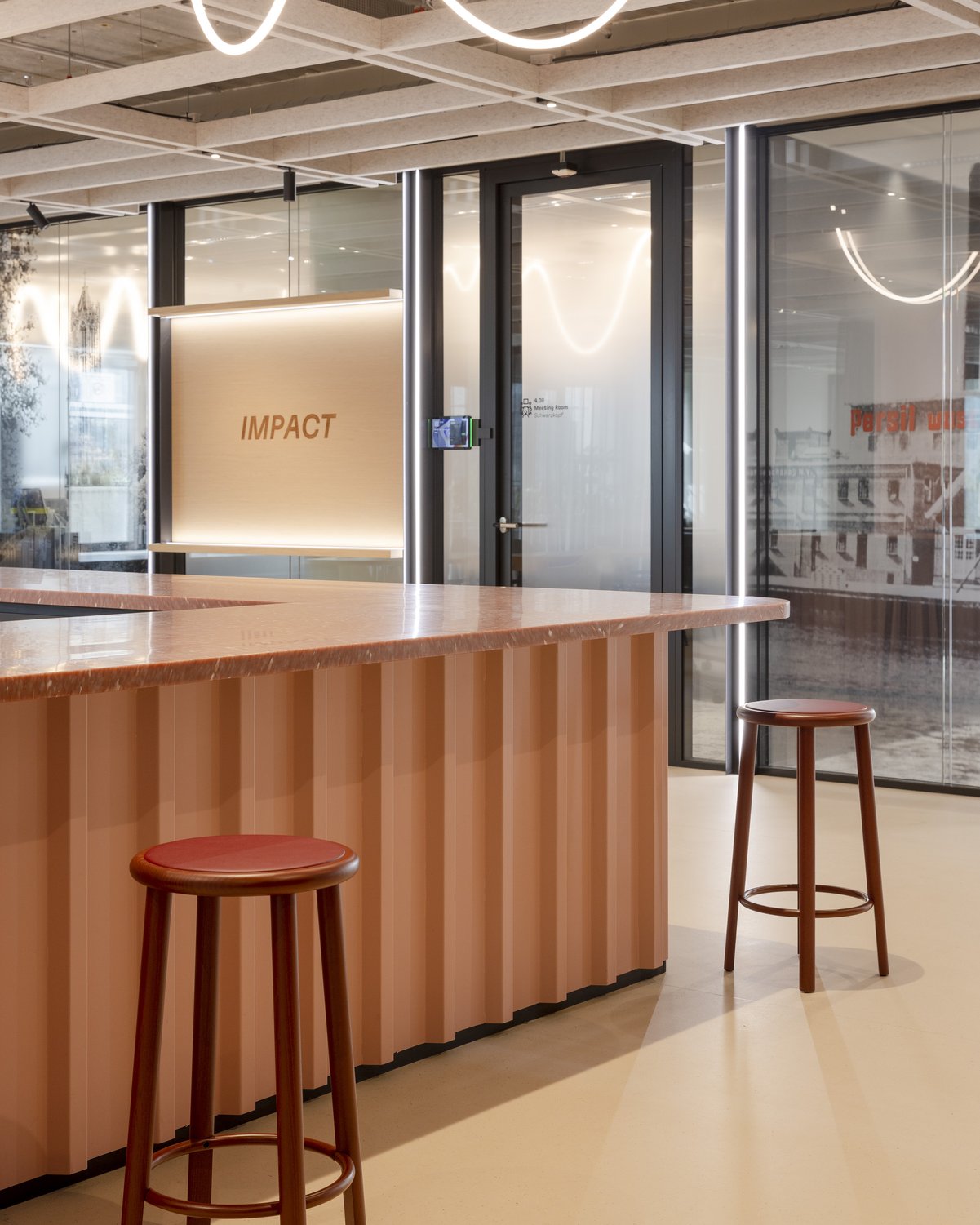 While the Amsterdam design focused on the diversity of people and brands, the Utrecht office places the Benelux market centre stage. Products and brands are experienced through oversized visuals, carefully positioned objects and dynamic photography that brings movement and energy into the space. Sharing the floor with the Academy of Hair allowed for a more expressive visual language and bold contrasts, while subtle industrial details refer to Utrecht’s history of steel and rail. The result is a distinctive yet cohesive working environment that invites, surprises and inspires confidence. Exactly what the Henkel brands stand for.