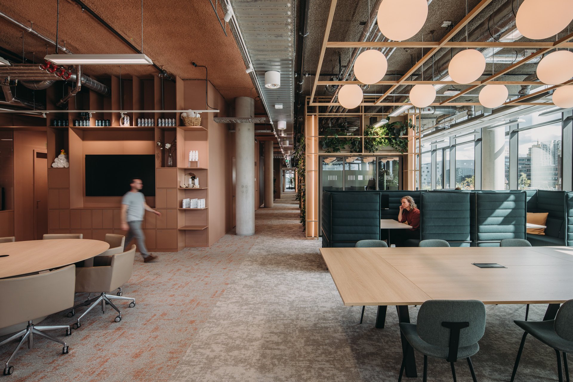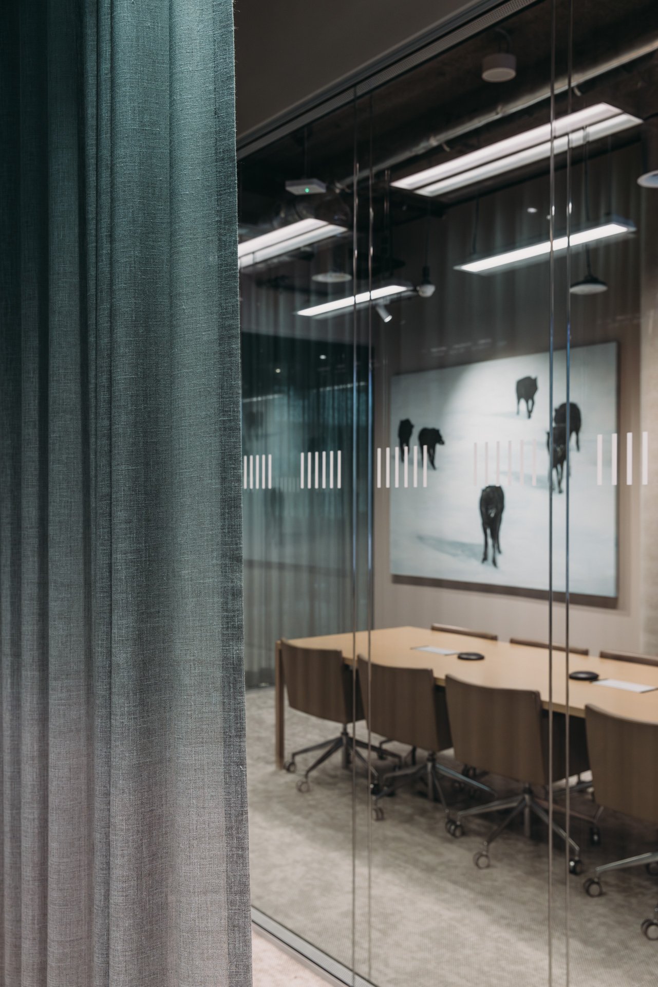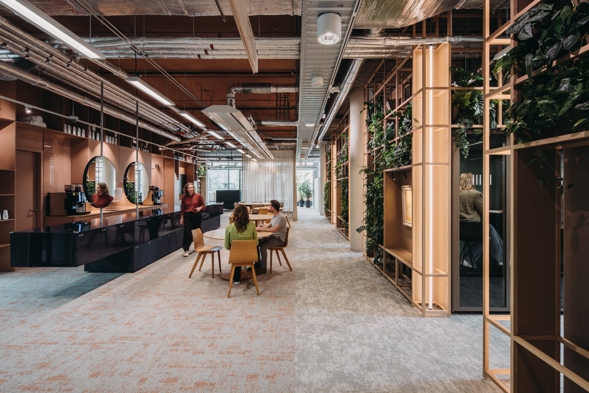 The outcome: a large-scale open floorplate where clarity and orientation coexist with lush green oases. Standard office clichés, like stand-alone phone booths, are reimagined, hidden in greenery and turned into sculptural elements. Art inspired by nature and animal figures brings a sense of wonder into the daily routine, subtly lifting the ordinary into something memorable. The play of curtains introduces a sense of mystery, with spaces appearing and disappearing with a simple gesture.