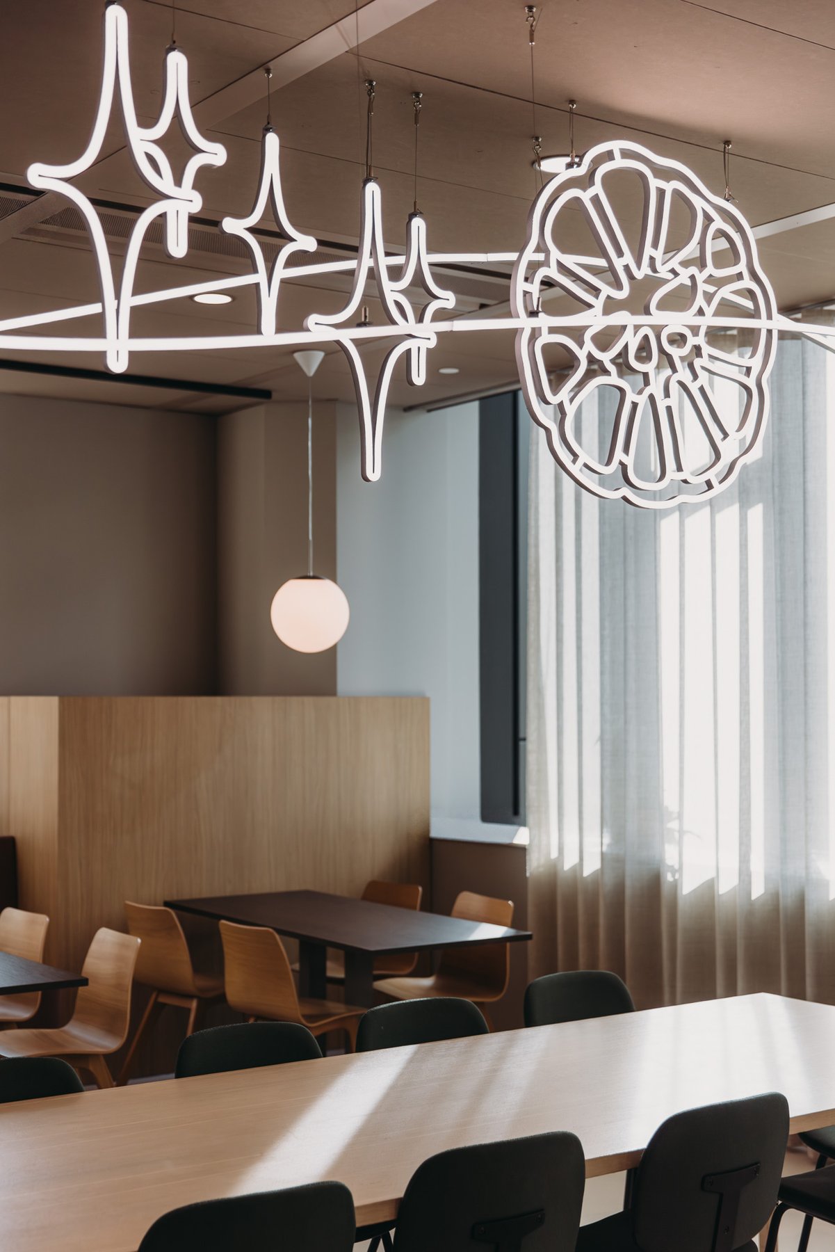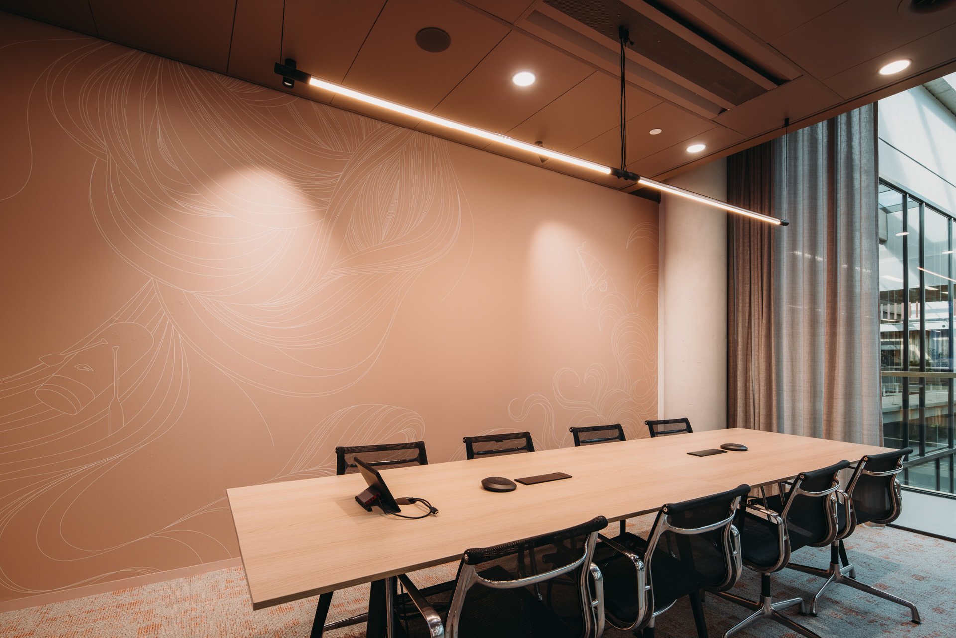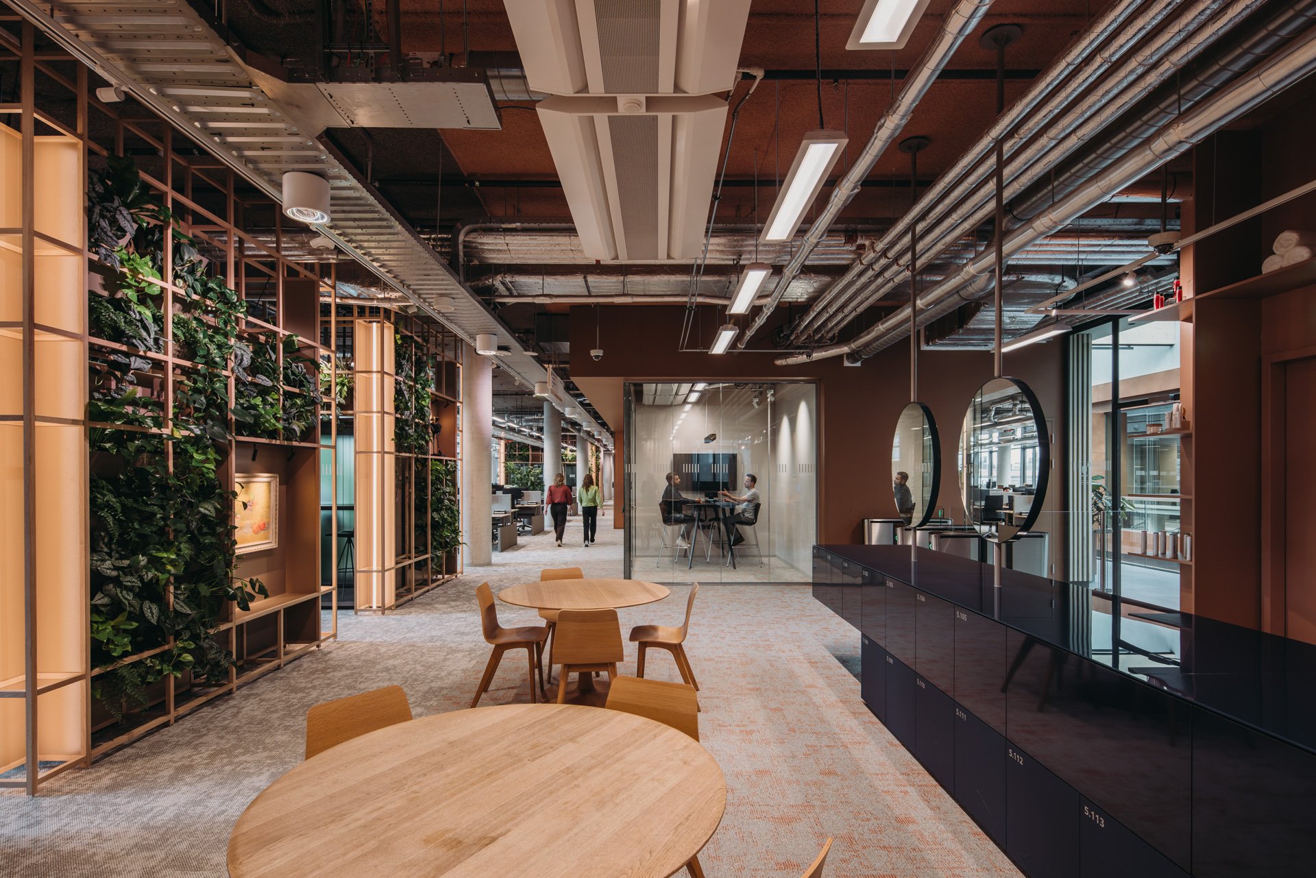 The outcome: a large-scale open floorplate where clarity and orientation coexist with lush green oases. Standard office clichés, like stand-alone phone booths, are reimagined, hidden in greenery and turned into sculptural elements. Art inspired by nature and animal figures brings a sense of wonder into the daily routine, subtly lifting the ordinary into something memorable. The play of curtains introduces a sense of mystery, with spaces appearing and disappearing with a simple gesture.