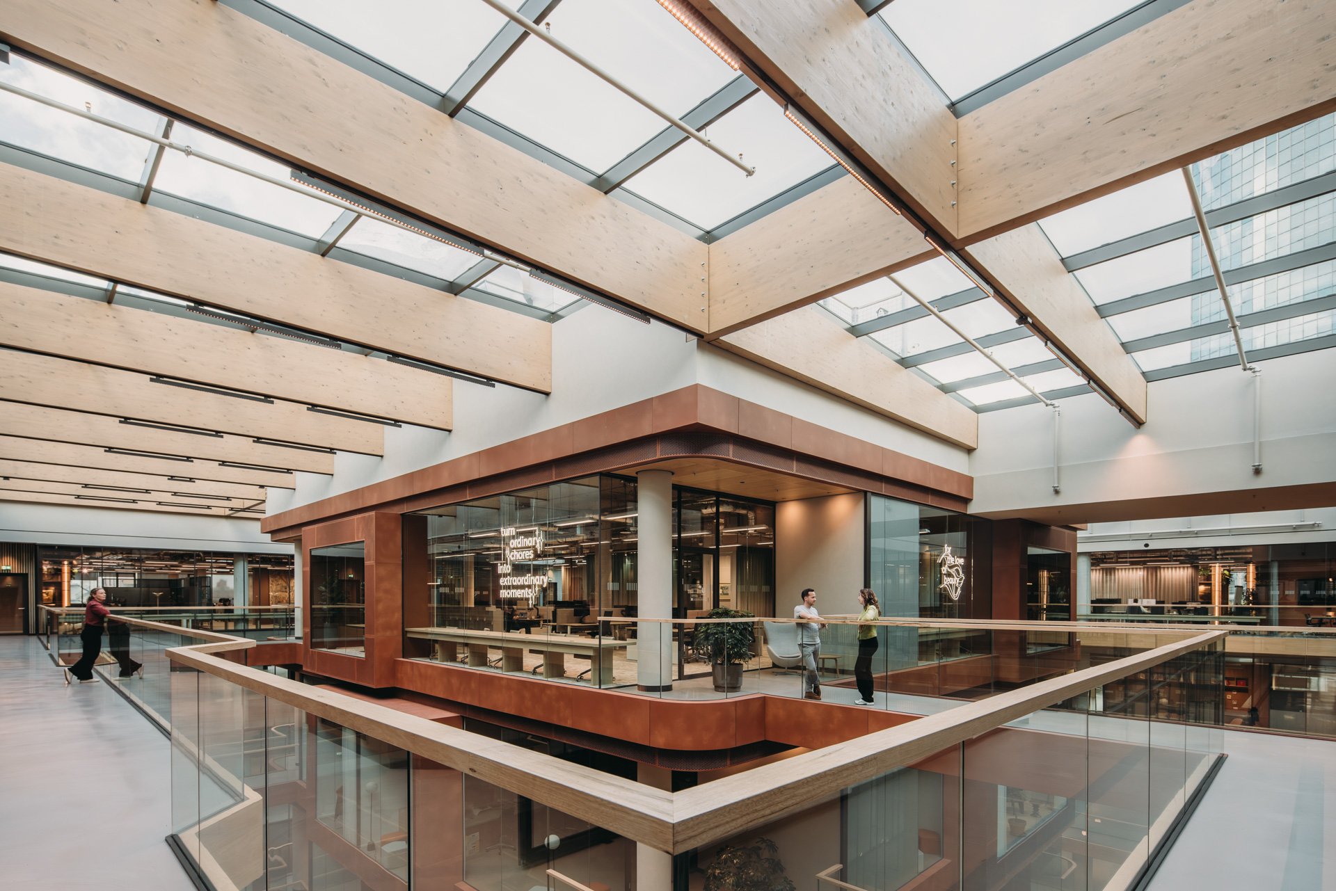 Unilever chose the former V&D department store, recently transformed through a successful renovation. Once a showcase for products, the building now houses an organisation that creates them. The office, wrapped around a central atrium, features a striking platform that offers a panoramic view across the entire floor. It is a space that connects, an essential quality in a time where people want to feel connected more than ever.